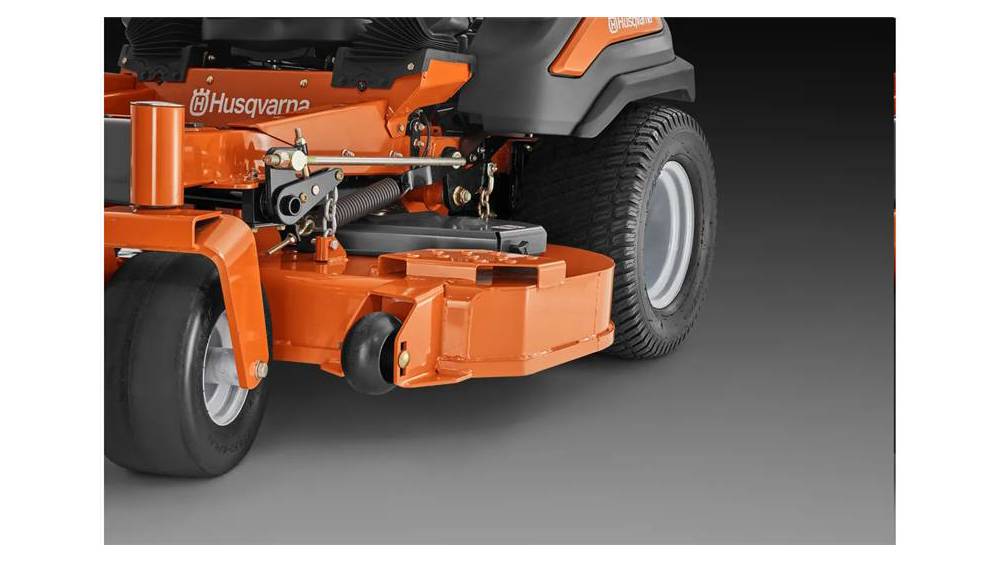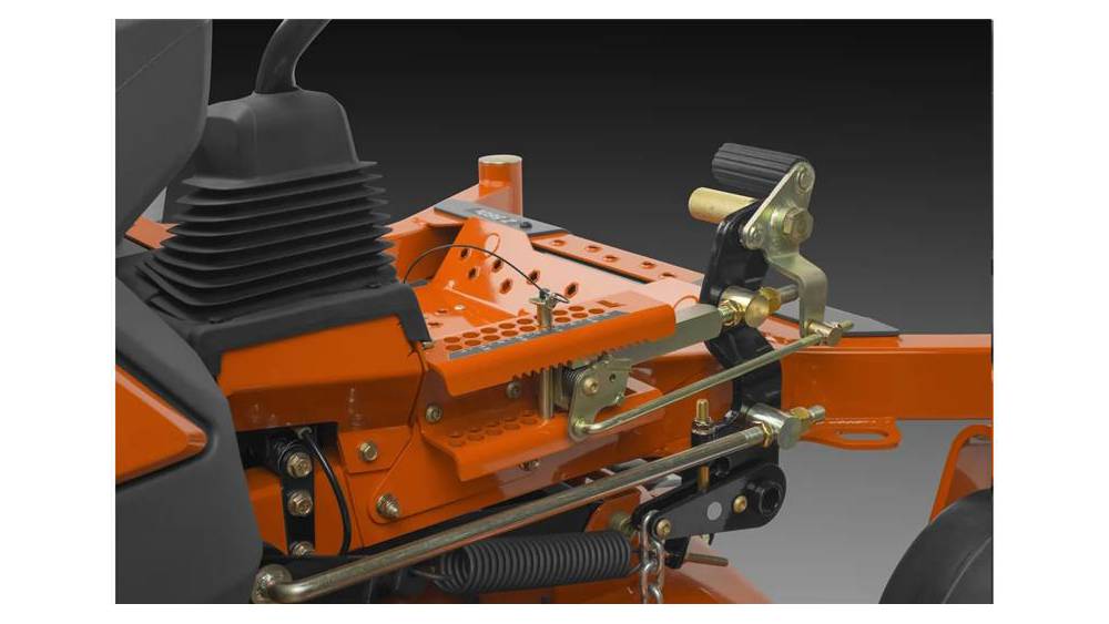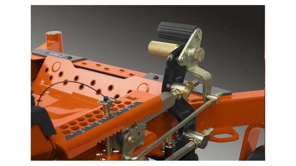 - Deck height adjustment: The deck lift system is spring assisted and allows convenient hand free operation. A simple locking pin adjusts cut height.