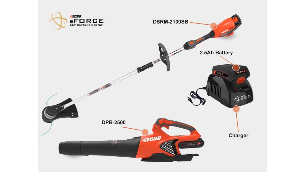 The DCP-BVRVS1B contains two 56V ECHO eFORCE® products in one convenient package. The Kit consists of the DSRM-2100 Trimmer with Speed-Feed® 400 cutting head and the DPB-2500 Blower along with a 2.5Ah battery and standard charger.