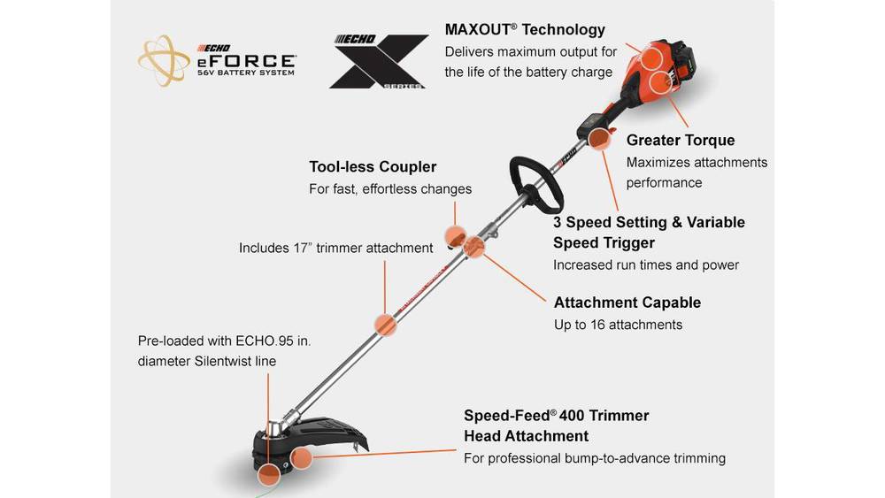 - Rubber handle grips: Same as those used on ECHO’s gas trimmers