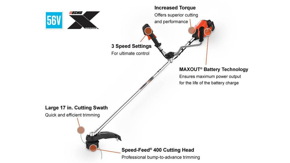 The ECHO power and performance you expect, but quieter. The DSRM-2600U brushcutter, powered by the ECHO 56V Battery System, pushes productivity to the next level. With a lightweight, ergonomic design and legendary ECHO power, it’s ready to tackle long days of long weeds and grasses.