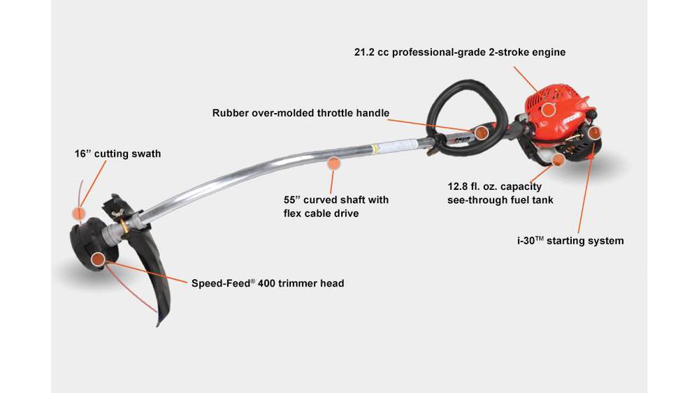 Power and productivity. The GT-225L curved shaft trimmer features a 55-inch shaft to increase reach and decrease effort. With a Speed-Feed® 400 trimmer head and an i-30™ starting system, it maximizes productivity without adding more work to the workday.