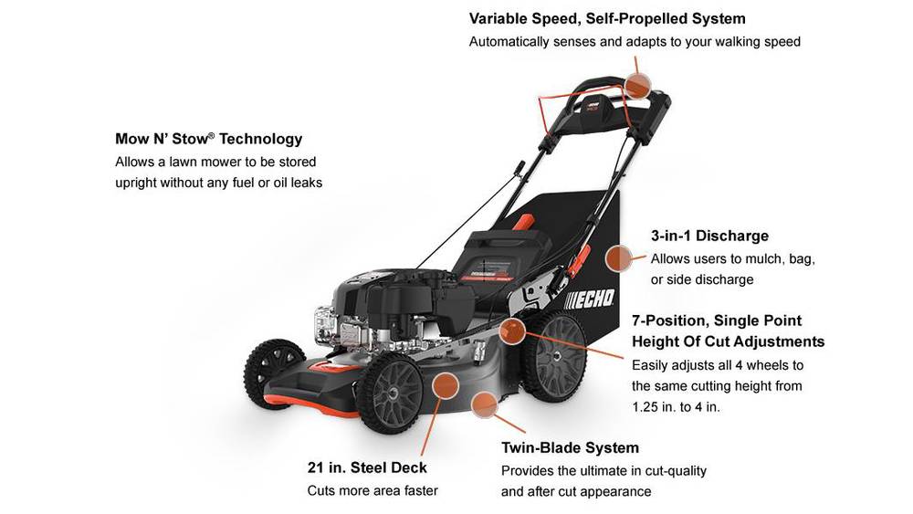 The ECHO LM-2119SP Self-Propelled Mower, designed for up to an acre, features a 190cc Briggs & Stratton® engine, variable-speed self-propelled system, and Mow N’ Stow for easy storage. It offers a 3-in-1 cutting system, dual blades, and adjustable mowing height for excellent performance on various terrains.