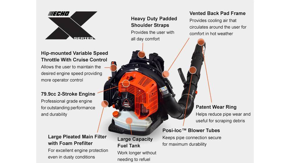 The ECHO X Series PB-7910H expands ECHO’s lineup of commercial-grade high-performance backpack blowers by providing higher power at a lower price point than competitive models. It features an advanced 79.9cc 2-stroke engine making it the most powerful blower on the market.