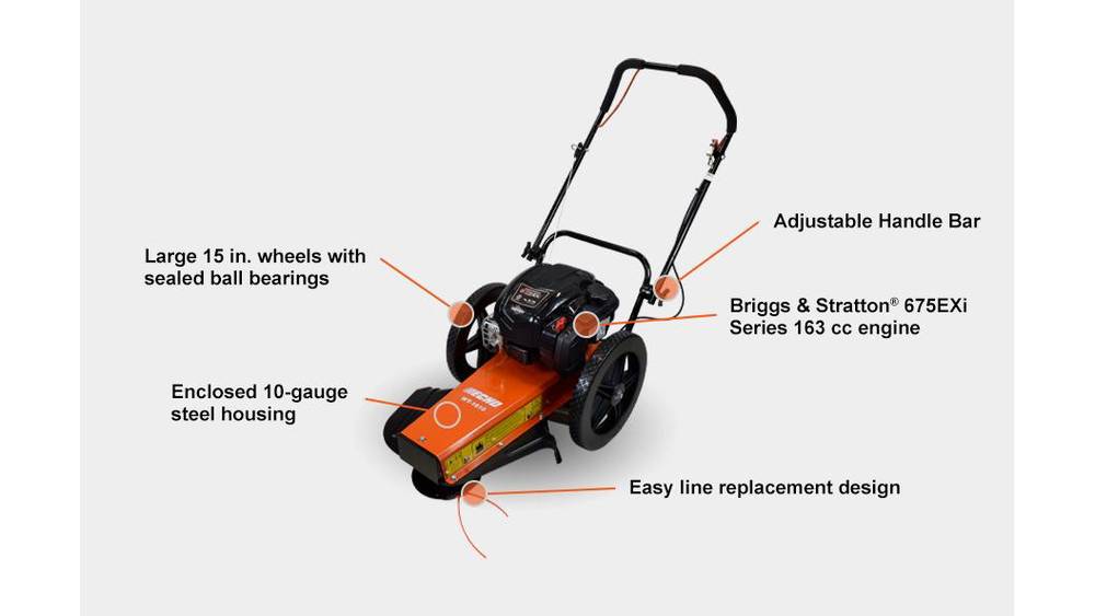 Tackle the tough-to-reach places. When the job calls for heavy trims along fences, rocks, retaining walls and other obstacles, the WT-1610 wheeled trimmer features a 24 in. cutting swath and is able to pivot up to 7.5° to deliver confident cuts that extend beyond the wheel base.